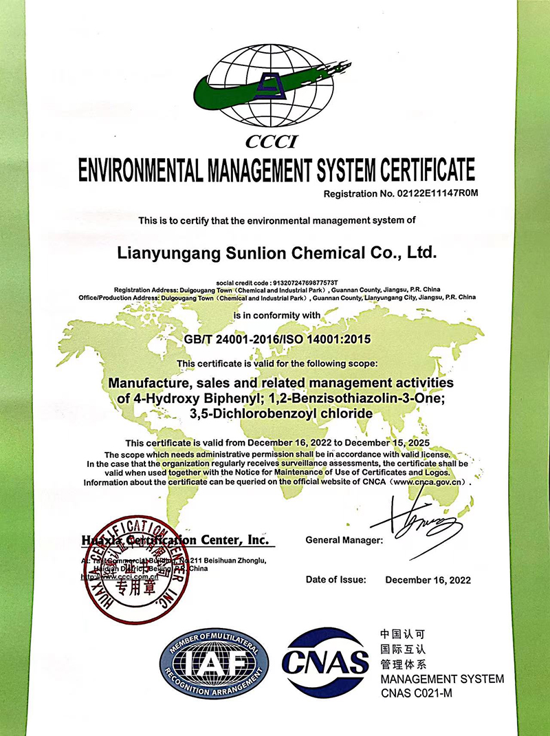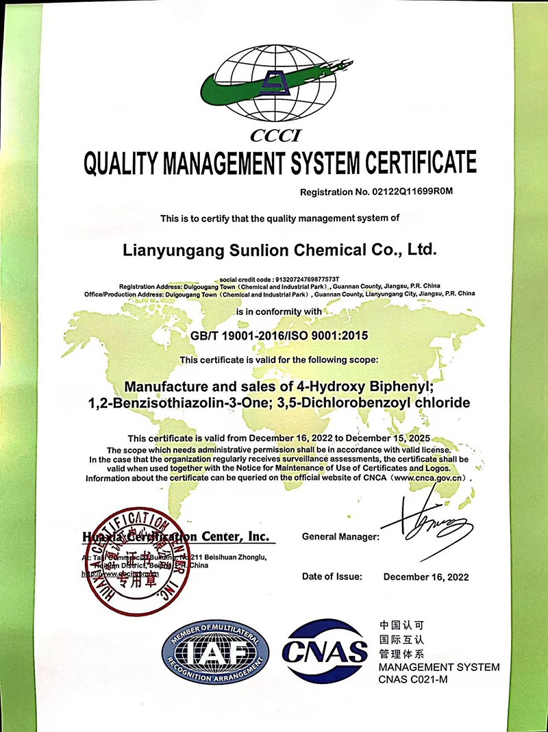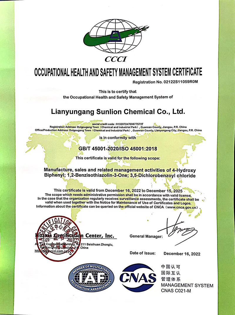 As an ISO 9001 certificated company, we have successfully established and performed the quality management system. The quality examination of the materials, the quality superintendence of the semi finished products, the quality control of the finished products, and the scientific examination system all give service to the production to assure the 100%product qualification rate. New Sunlion Chemica has also established the standard operation procedure and performance evaluation system to make sure that the operation is qualified and stable.